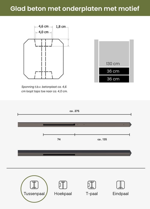 Combineer de betonpalen met rots-,leisteen-, of houtmotief betonplaten en plankenschermen 180x130 cm.
