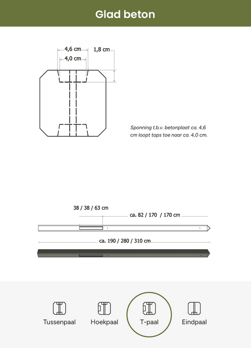 Antraciet betonpalen van 280 en 310 cm zijn voor zowel rechte als toogschermen te gebruiken.