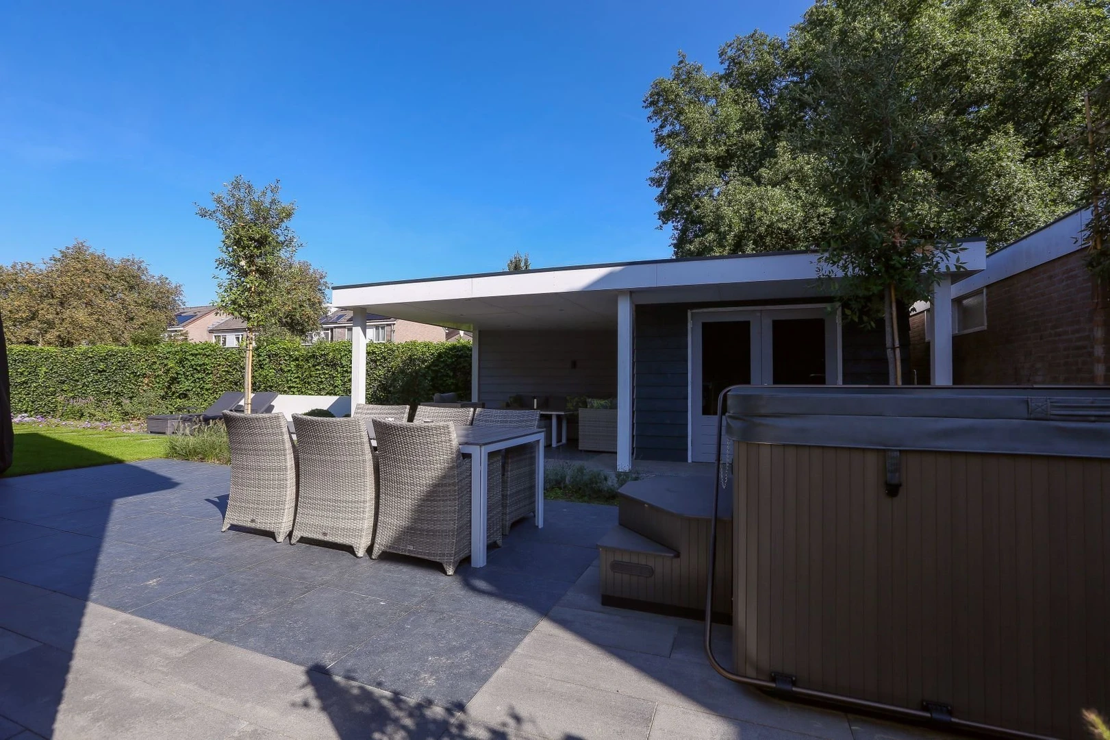 Chique en moderne familietuin met strakke overkapping waar een mooie jacuzzi geïnstalleerd is. Aan de buitentafel is ruimte voor het hele gezin en de ligbedden zorgen voor een heerlijk relaxmomentje.