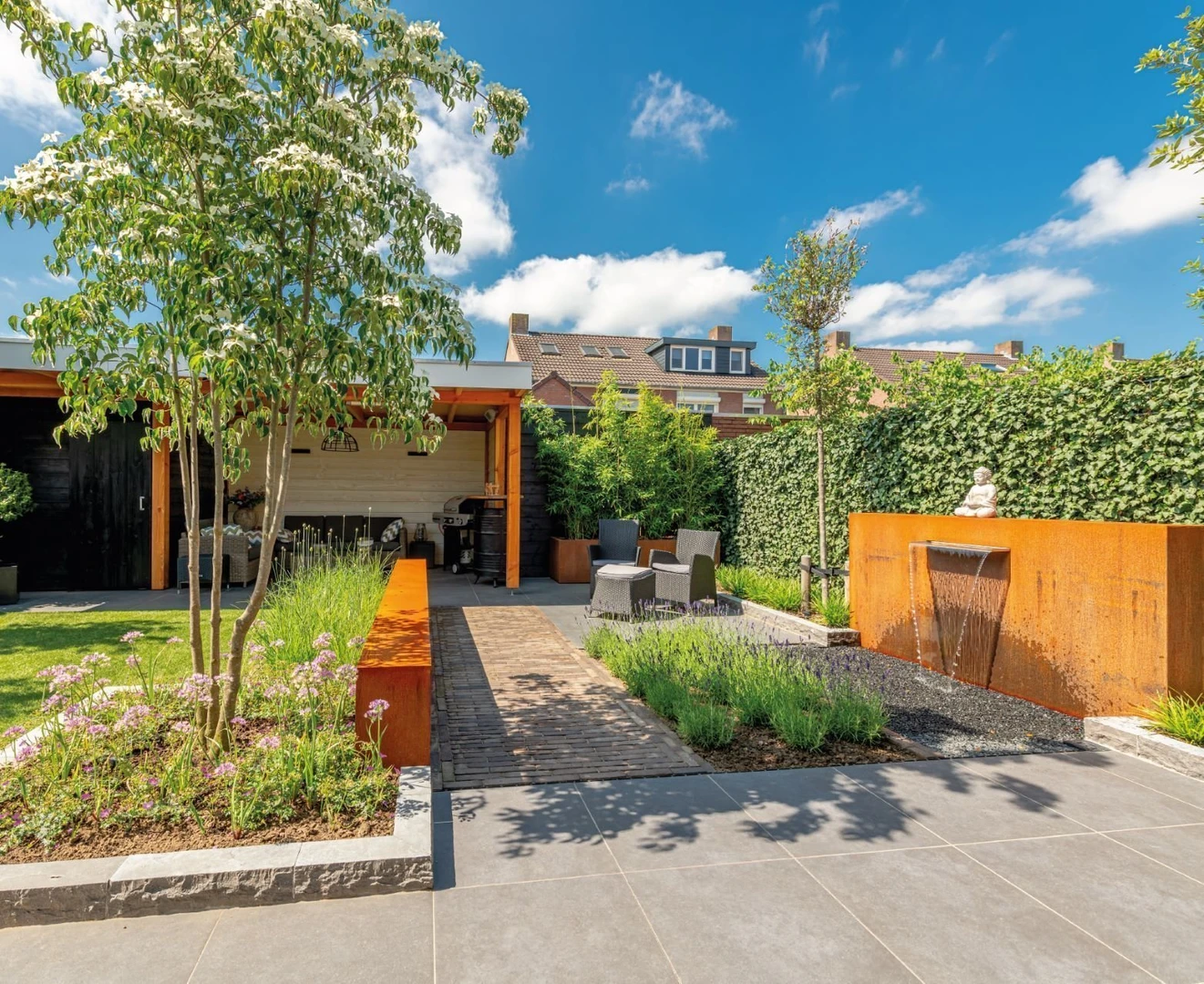 Door te letten op de materialen die je gebruikt, kun je iets terugdoen voor het milieu. Dit is waarom Ruud zo veel waarde hecht aan duurzame materialen. “Wij kiezen altijd materialen die lang meegaan en die óók duurzaam worden geproduceerd. Er zijn veel verantwoorde producten die je kunt gebruiken. Denk bijvoorbeeld aan FSC-gekeurde houtsoorten en herbruikbare bestrating.” Duurzaamheid kun je volgens Ruud op vele manieren doorvertalen in je tuin. “Door een hoge boom te laten staan, kun je al veel meer CO2 opvangen dan door het planten van een nieuwe boom. Bovendien geeft de boom op warme, zomerse dagen schaduw en verkoeling. Een boom die bijvoorbeeld bijen en vogels aantrekt is weer goed voor de biodiversiteit.”