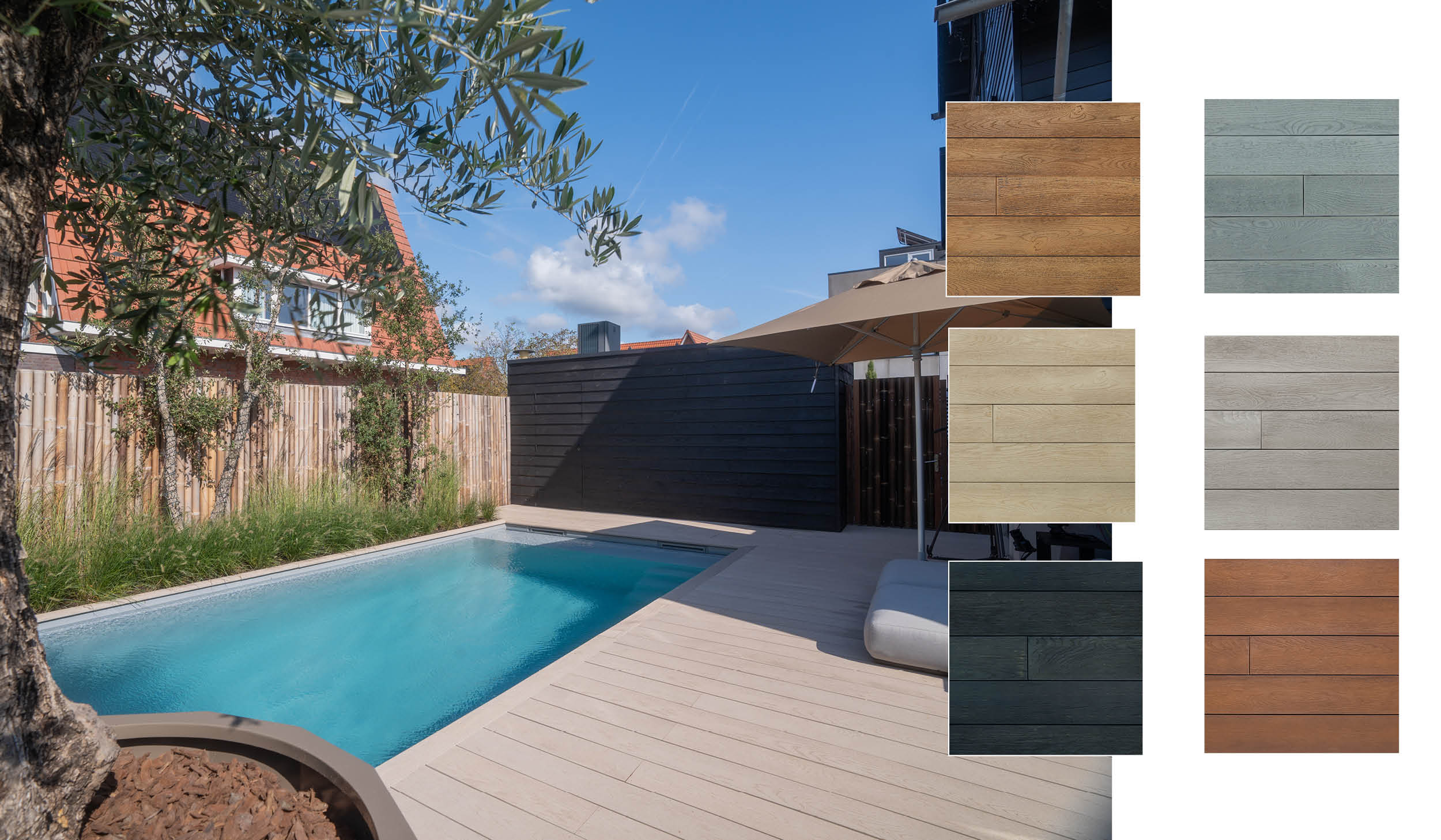 In de eerste aflevering van seizoen 3 van Het Goede Buitenleven zag je hoe je de sfeer van je woonkeuken naadloos doortrekt naar een schitterende wellnesstuin. Rondom het zwembad stralen de Millboard Enhanced Grain vlonderplanken in de kleur Limed Oak, perfect gecombineerd met Castle Grind voor een lichte, natuurlijke uitstraling. En langs de zijkant van het zwembad zorgen bamboepalen voor een stijlvol Aziatisch tintje.