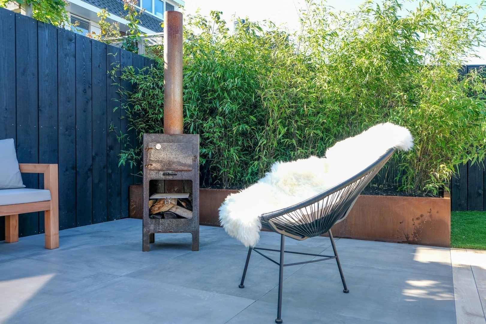 Een strakke, moderne tuin met 90x90 keramische tegels van Piet Boon. De cortentalen bloembakken met daarin het bamboe zorgen voor een speels karakter