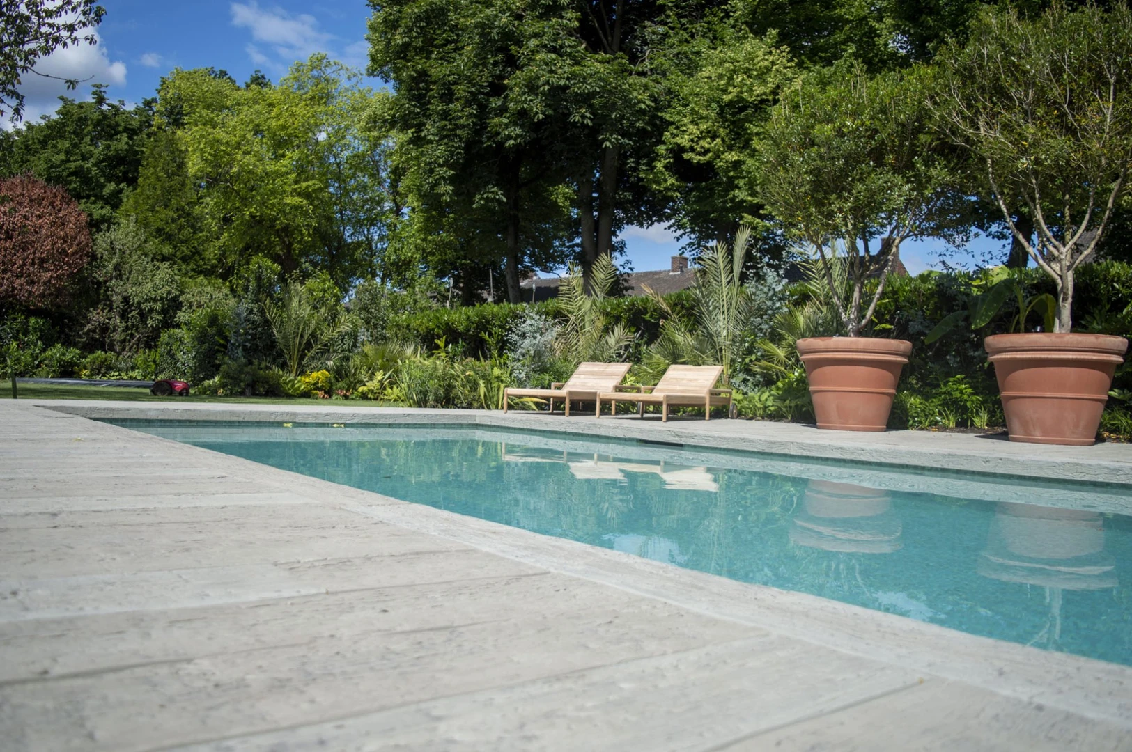 Een prachtige zwembad tuin met millboard vlonderplanken rondom het zwembad. Millboard is het alternatief voor hardhout en composiet. Het zijn de meest natuurgetrouwe kunststof terrasplanken die momenteel verkrijgbaar zijn! De vele mediterrane planten en in-lite verlichting zorgen voor een mediterrane sfeer.