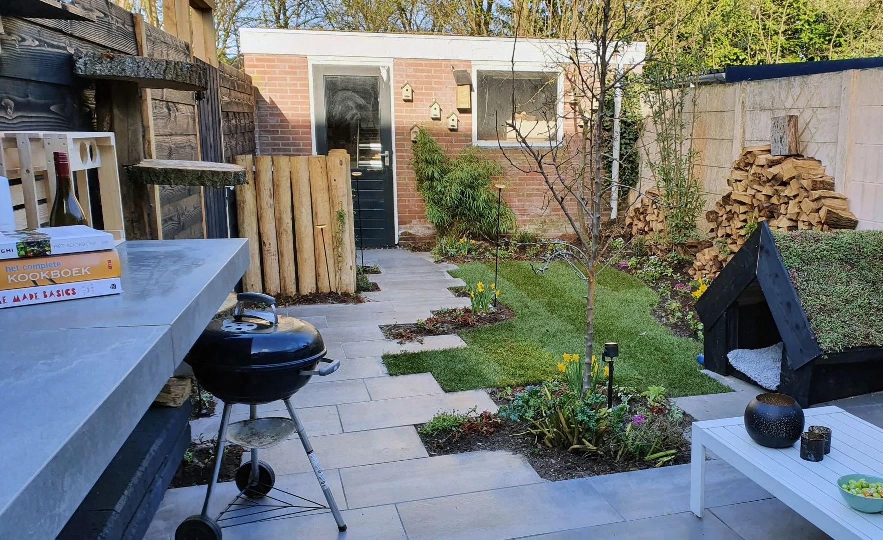 Een strakke thuiswerktuin waar het hele gezin kan genieten. Zelfs aan de hond is gedacht!