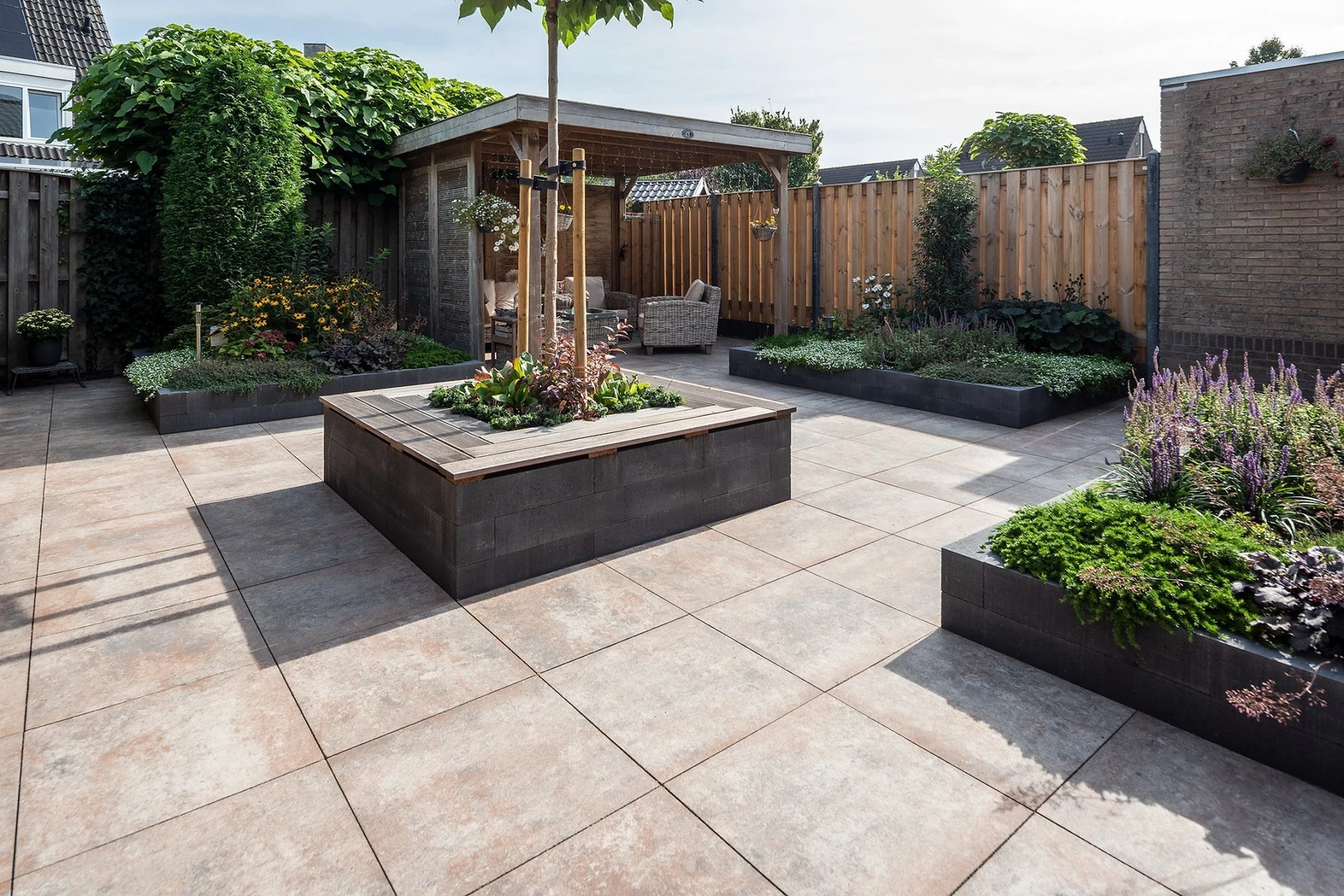 Een knusse, strakke achtertuin waar in de hoek een knusse overkapping gecreëerd is. De mooie Terras & Trends tegels in de kleur Allemagne Bruin Gevlamd zorgen voor een natuurlijke uitstraling.